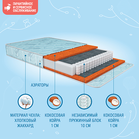 Детский матрас Nuovita Anelo. Максимальная нагрузка на матрас 30 кг. Состав наполнителя: независимый пружинный блок 10 см + кокос 1 см + кокос 1 см (с каждой стороны), аэраторы. технология соединения слоев - Hot-Melt. Жесткость матраса выбирается по сезонности либо по комфортности, одна сторона матраса обладает жесткостью "выше среднего", другая - "средней". Чехол матраса несъёмный, выполнен из хлопкового жаккарда.
