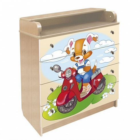Комод с трансформируемой крышкой Влана КДП 80/4-02 "МОКИК" - рассчитан на экономию места в детской комнате. Это достигается благодаря тому, что пеленальный столик складывается и раскладывается, изменяясь в размерах практически в два раза. Четыре вместительных выдвижных ящика пеленального комода позволят разместить в нем большое количество разнообразных вещей. Комод  отличается очень ярким и интересным дизайном. Рисунок  нанесен  на поверхность высококачественного МДФ, из которого сделан фасад комода по системе КМП-Печати.