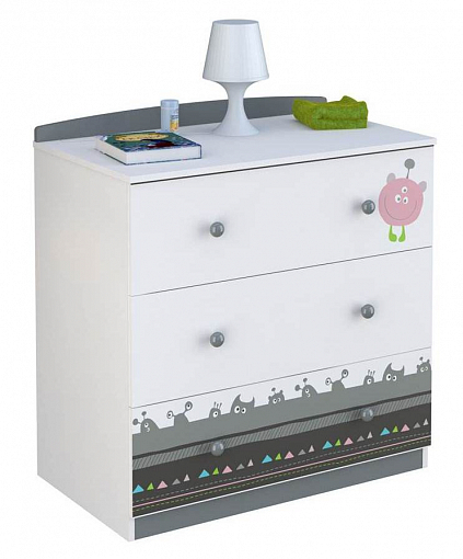 Комод Polini Basic Монстрики выполнен в спокойных тонах с веселым рисунком на фасадах в виде монстриков. Комод имеет 3 вместительных ящика на роликовых направляющих. Изготовлен из ЛДСП Kronospan (Австрия), который соответствует европейским стандартам качества EN 316 и нормам EN 622. В печати рисунка использовались чернила. имеющие сертификат качества EC No. 1907/2006 и EU No. 453/2010. К комоду можно приобрести пеленальную рамку арт.0001214.9 (продается отдельно).